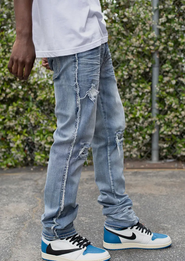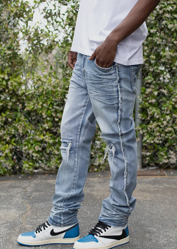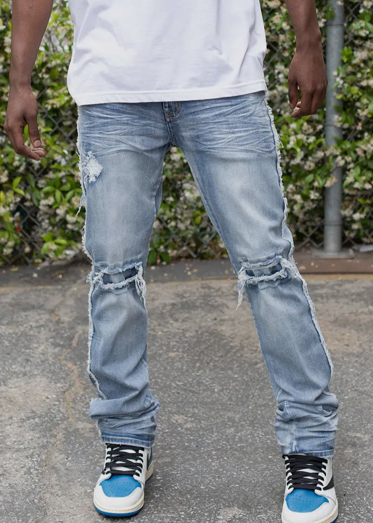 Our Victorious-Billyunayr Distressed Raw Denim Jeans come in a variety of sizes, all with a 36 inch inseam. They feature distressed details and a classic zip and button fly closure, as well as a five pocket design. Made with comfort stretch denim, these jeans are both stylish and comfortable. Our exclusive jeans are constructed with high quality materials, including a high-end vintage acid wash and a blend of 97% cotton and 3% spandex with a medium thread count of 500-800. These jeans offer the best of both worlds, with a softness that increases with each wash and a durable design thanks to the higher thread count. Experience the perfect balance of comfort and durability with our Victorious-Billyunayr jeans.